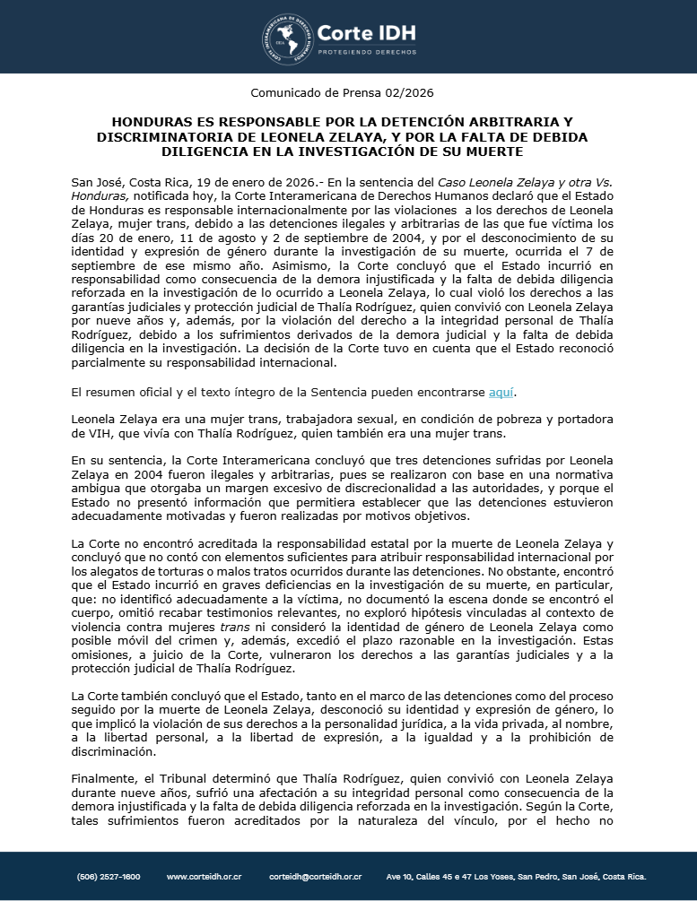La Corte IDH había emitido el 2 de octubre de 2025 la sentencia de gran alcance que declara la responsabilidad internacional de Honduras por las violaciones a los derechos humanos de Leonela Zelaya, mujer trans trabajadora sexual asesinada en 2004, y de su compañera Talía RodríguezLa sentencia, notificada formalmente el 13 de enero de 2026, constituye un hito en la jurisprudencia regional sobre violencia por prejuicio de género y los derechos de la comunidad LGBTI+.