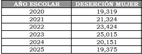 Cuadro de texto: Ilustración 2 tabla obtenida por: SISTEMA DE ADMINISTRACIÓN DE CENTROS EDUCATIVOS (SACE)La deserción escolar de niñas y adolescentes continúa siendo un desafío para el sistema educativo hondureño. Según información oficial proporcionada por la Secretaría de Educación, a través del Sistema de Administración de Centros Educativos (SACE)y laUnidad del Sistema Nacional de Información Educativa de Honduras (USINIEH), entre los años 2020 y 2025 se registraron 128,578 casos de deserción escolar de niñas y mujeres jóvenes.
