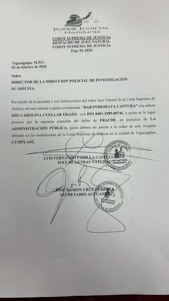 Tegucigalpa, Honduras. La Corte Suprema de Justicia de Honduras libró hoy órdenes de captura contra el exministro de la Secretaría de Desarrollo Social (Sedesol), José Carlos Cardona, y la diputada Isis Carolina Cuéllar Erazo. Se les acusa de la comisión del delito de fraude en perjuicio de la administración pública.