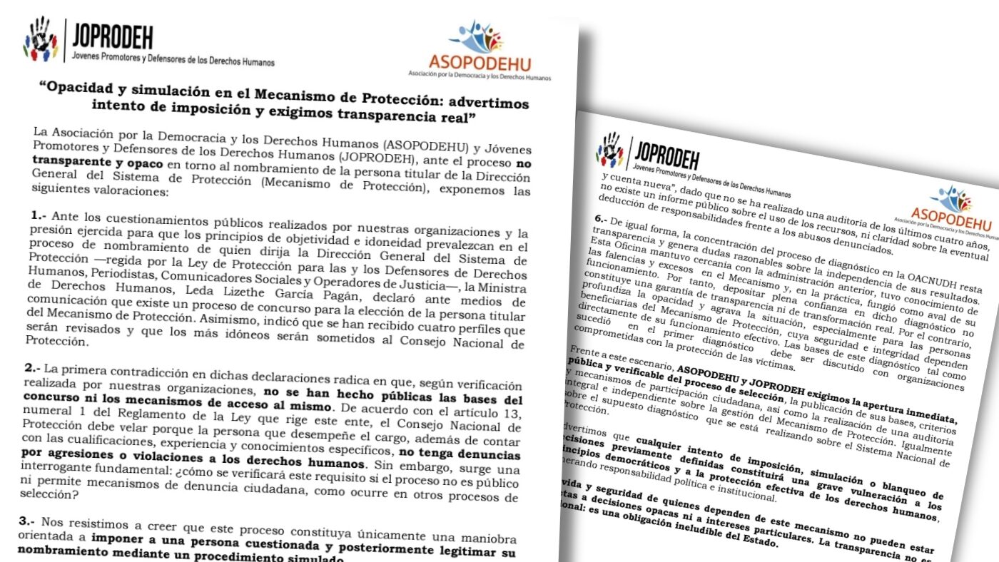 La Asociación por la Democracia y los Derechos Humanos (ASOPODEHU) y Jóvenes Promotores y Defensores de los Derechos Humanos (JOPRODEH), ante el proceso no transparente y opaco en torno al nombramiento de la persona titular de la Dirección General del Sistema de Protección (Mecanismo de Protección), exponemos las siguientes valoraciones: