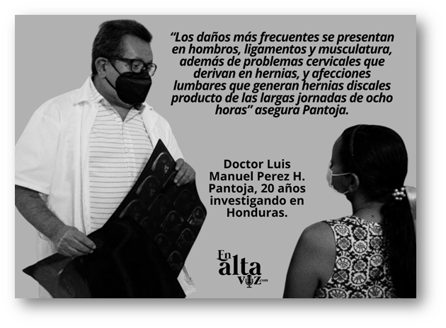 Durante sus investigaciones en el país, Pérez H. Pantoja ha conocido más de 800 casos. “Los daños más frecuentes se presentan en hombros, ligamentos y musculatura, además de problemas cervicales que derivan en hernias, y afecciones lumbares que generan hernias discales producto de las largas jornadas de ocho horas” asegura Pantoja.