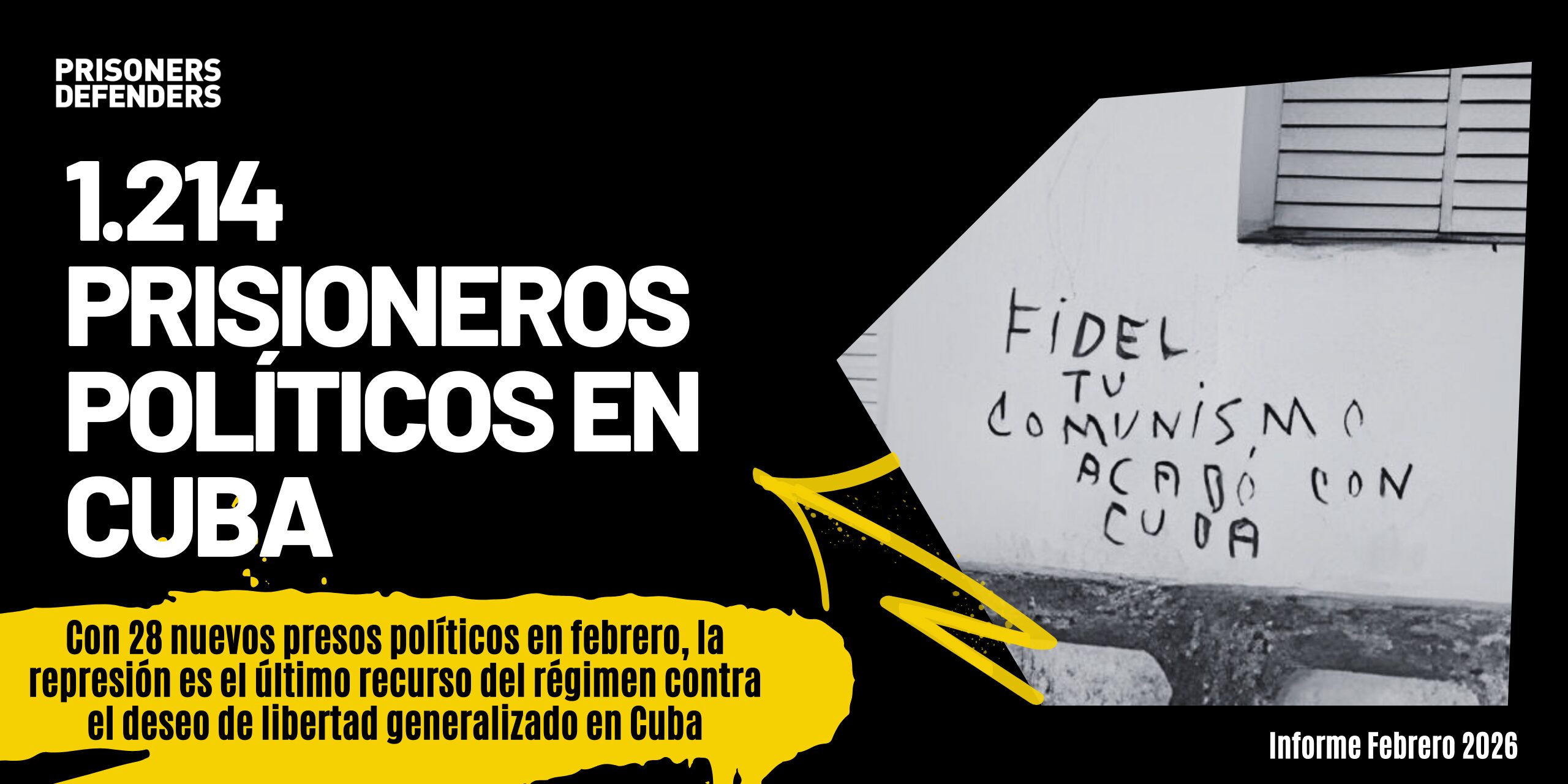 Con cierre de datos a fecha 28 de febrero de 2026, la lista de prisioneros políticos en Cuba contiene un total de 1.214 prisioneros políticos y de conciencia sufriendo sentencias judiciales o disposiciones de limitación de libertad por parte de las “Fiscalías” sin supervisión judicial alguna, debido proceso o defensa efectiva, en flagrante violación de la ley internacional, lista que cada mes hacemos pública y distribuimos en todos los ámbitos políticos, diplomáticos y de defensa de los derechos humanos. En los últimos 12 meses (1 de marzo de 2025 al 28 de febrero de 2026) la lista de prisioneros políticos de Cuba sumó un total de 168 presos políticos nuevos en Cuba (un promedio de 14 presos políticos nuevos en Cuba cada mes). Esto supone que a lo largo de estos 12 meses estuvieron presentes en la lista un total de 1.310 presos políticos en Cuba, recordamos una vez más, todos ellos torturados, como demostramos con el análisis en profundidad de 181 casos tomados de forma aleatoria para realizar el Primer Estudio Integral sobre la Tortura en Cuba.