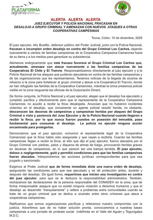 Después del ataque, la Plataforma Agraria ha emitido una alerta urgente advirtiendo que este fracaso favorece al grupo criminal Los Cachos, que actualmente amenaza con atacar nuevamente a las familias campesinas de las cooperativas El Chile y El Tranvío. Responsabilizamos directamente al juez ejecutor y a la Policía Nacional de los ataques que pudieran ejecutarse en contra de las familias campesinas y de las organizaciones que les representamos. Tenemos noticias de la llegada de sicarios de refuerzo a la zona para fortalecer al grupo criminal y atacar a la Cooperativa El Tranvío, donde se han refugiado las familias de la Cooperativa Camarones, mientras la única presencia policial visible en la zona resguarda las oficinas de la Corporación Dinant”.