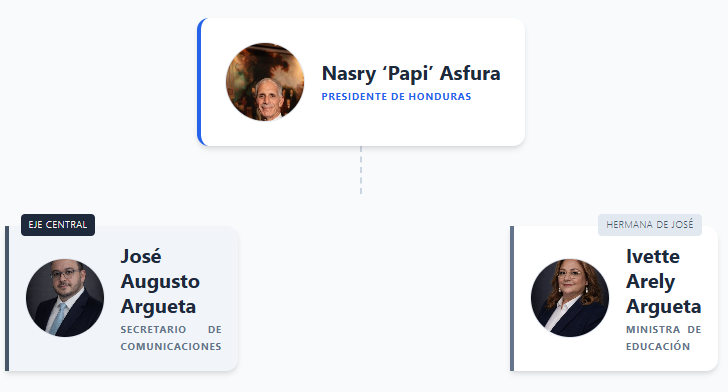 El núcleo del poder se teje alrededor de los hermanos José Augusto Argueta Padilla, nombrado secretario de Comunicaciones, Ivette Arely Argueta, nueva ministra de Educación. Ambos son hermanos e hijos de Vera Padilla Girón y José Argueta Cardoza.
