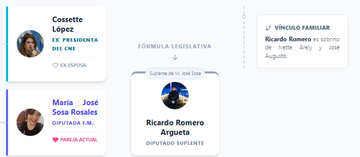 La «gente» a la que alude Cardona parece ser precisamente el nuevo núcleo de poder. La red se amplía con María José Sosa, diputada por Francisco Morazán y pareja actual del secretario Argueta Padilla, con quien tiene una hija. Su diputado suplente es Ricardo Sebastián Romero Argueta, sobrino de ambos ministros.