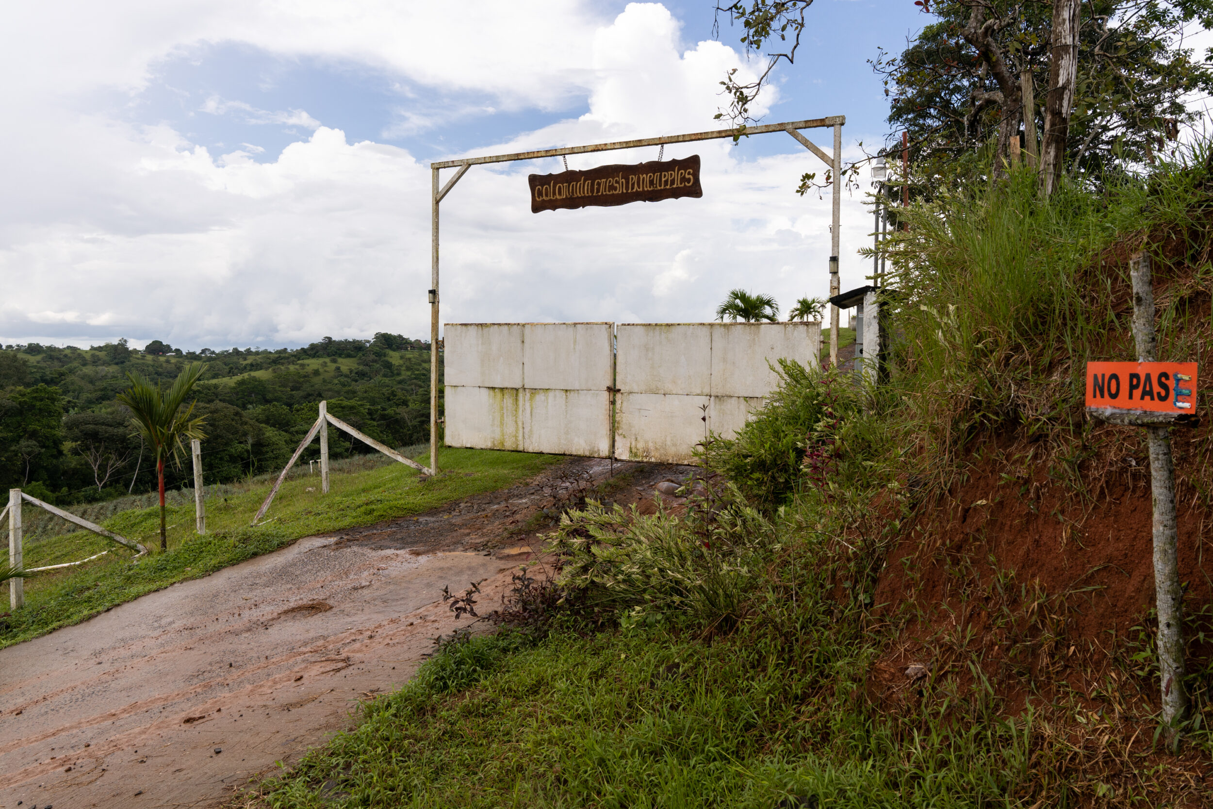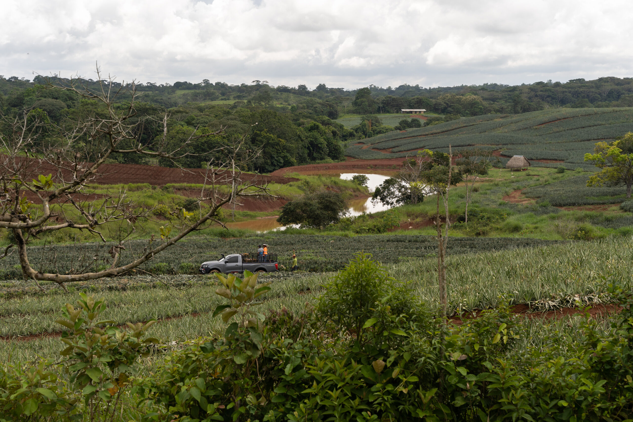 El peón se asoma desde lo alto de la cuesta. Moreno y voluminoso, está vestido con overol gris y un sombrero de ala ancha. Es parte de la indumentaria utilizada en los cultivos de piña que se supone que lo proteja al momento de aplicar pesticidas y otros productos de riesgo.